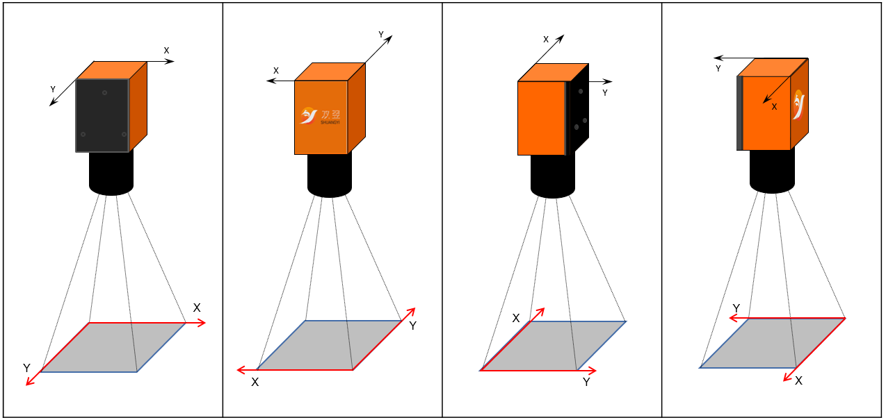 相机安装方向在满足实际视野长宽需求的前提下,一般要求符合显示器的界面坐标,所以相机优先如右图安装,或者其他方向通过镜像调整到和显示器一致的坐标系,以符合操作习惯。