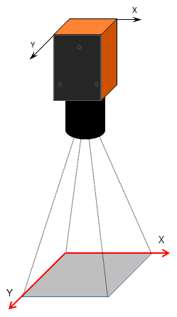 2.实际安装中,相机的方向不同,相机的坐标系也不同。以操作台站立的位置为基准,相机自上往下拍时,相机的坐标系如下: