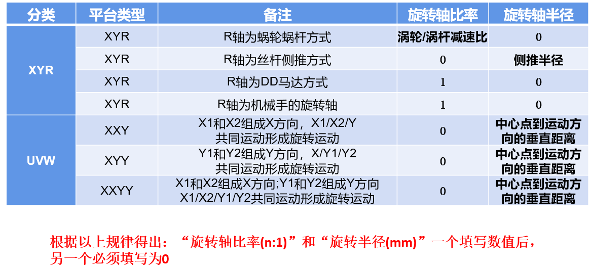 对于运动平台,如果我们需要控制XY方向的移动,我们就需要了解平台XY丝杆的螺纹距和驱动器的细分。如果我们需要控制平台旋转,除了以上两个信息我们还需要了解平台的半径,平台的结构类型。