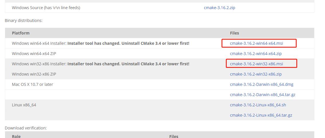1)下载cmake : https://cmake.org/download/         在这我选择可以直接在windows安装的文件,如我这下载的是 cmake-3.16.2-win32-x86.msi。可以根据自己的系统来选择32位或者64位。