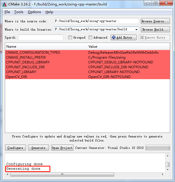 点击“Generate” 然后cmake自动生成VS工程。如下状态显示 Generate Done