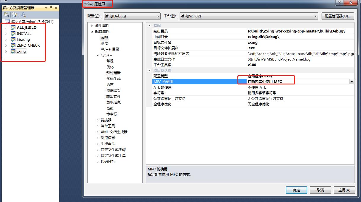由于我要使用的zxinglib.lib 是在其他工程使用,必须跟所在的工程MFC使用库保持一致,否则无法编译通过(msvcprtd.lib(MSVCP100D.dll) : error LNK2005: "public: virtual __thiscall std::basic_ios<char,struct std::char_traits<char> )。所以这里我选择了在静态库中使用MFC跟我要用的MFC工程保持一致。