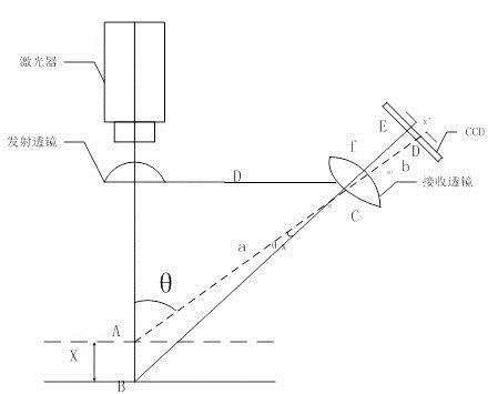 当被测物体表面移动x,反应到光敏面上像点位移为x’。a为接收透镜到物体的距离(物距),b为接收后主面到成像面中心的距离(一般取焦距f),θ为激光束光轴与接收透镜之间的夹角。D为激光光束轴到透镜中心的距离。接收透镜的焦距为f,其余的参数如下图: