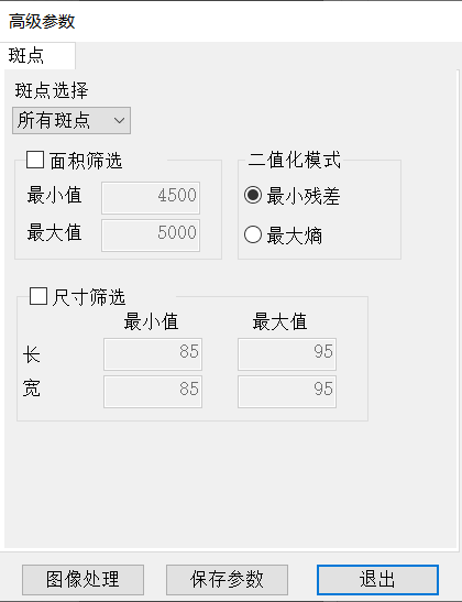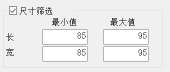 通过设置尺寸的最小值、最大值,进行斑点筛选。尺寸(长、宽)在最小值、最大值之间的斑点被保留,之外的斑点被剔除。