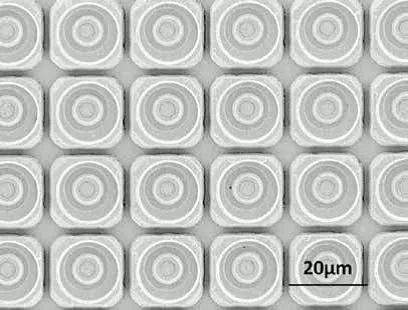 图3.有源矩阵microLED微显示器上的20μm间距像素阵列。