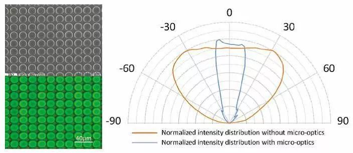 图5. 集成在有源矩阵microLED微显示器面板上的微光学器件以及测量的具有/不具有微光学器件的发光角度分布。