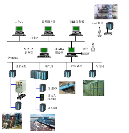SCADA的英文是Supervisory Control And Data Acquisition,译成中文就是监控与数据采集。从其名称可以看出,其包含两个层次的功能:数据采集和监控。下图所示为一个市政工程SCADA系统。