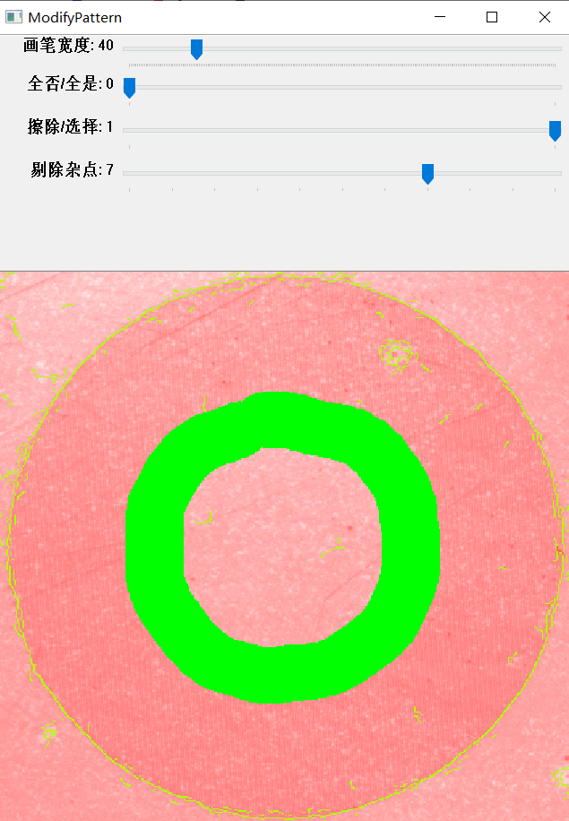 如模板存在干扰的边缘特征点,可以对模板轮廓进行修改优化,从而改善轮廓匹配搜索目标的性能。算法在提取边缘特征点时,将不再考虑被涂的红色区域内的特征点。