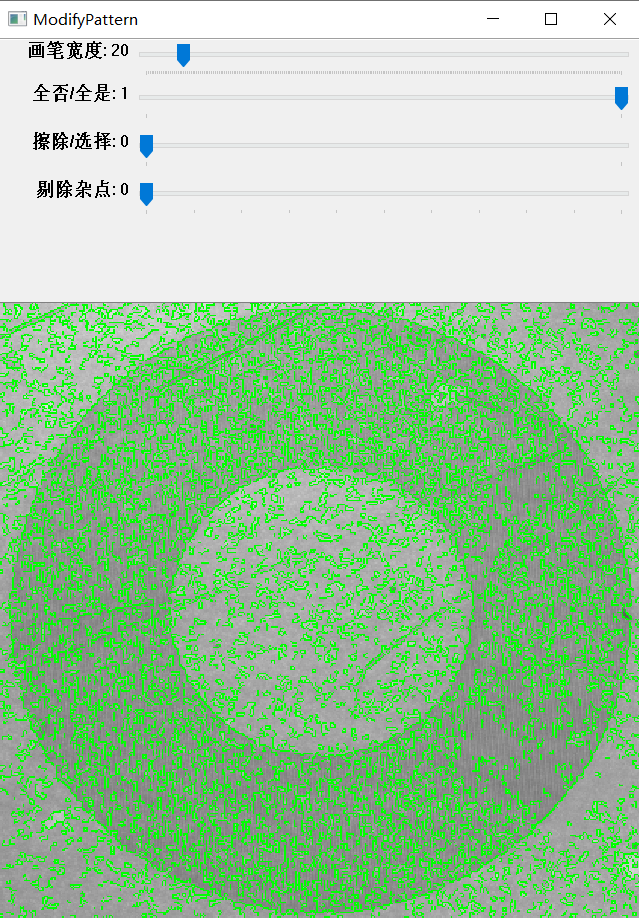 当图像的质量较差时,边缘模糊产生大量的杂点;从而增加了搜索的时间,同时影响了搜索的准确性。通过调整【剔除杂点】去除大部分的干扰点,优化了模板的轮廓信息。