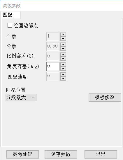 通过鼠标操作ROI选定模板,进入【高级参数】设置匹配角度范围,最小相似度分数,并可修改模板。
