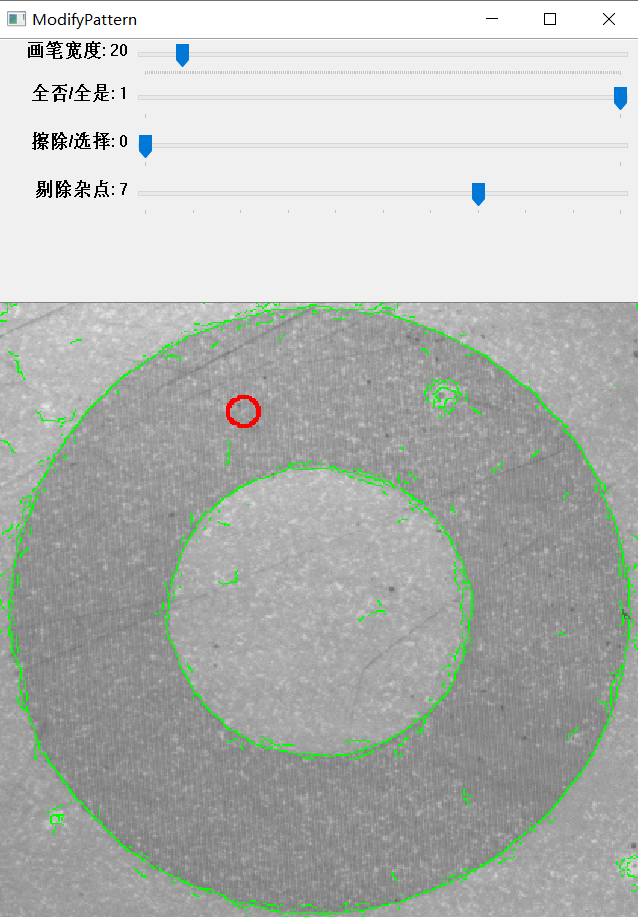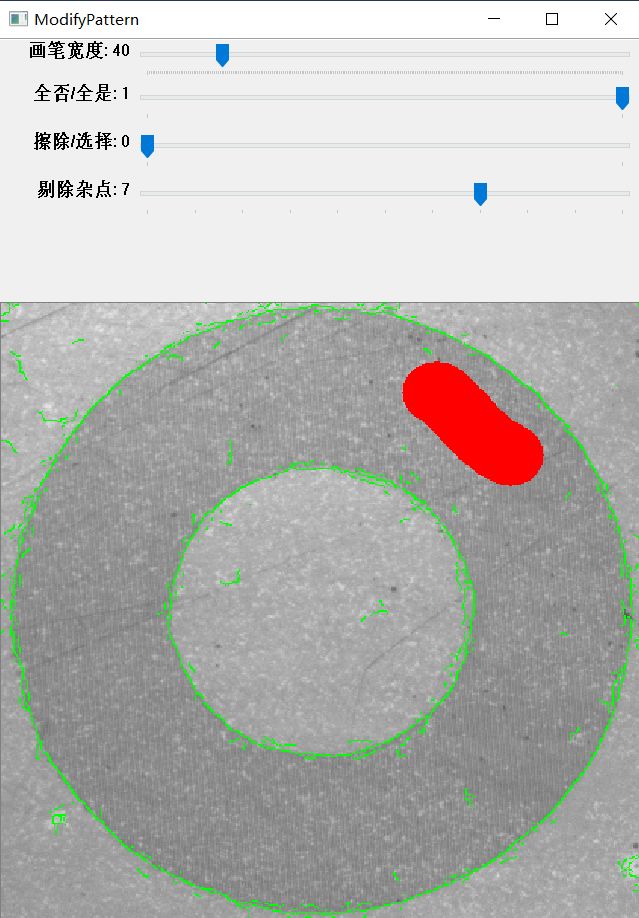 如模板存在干扰的边缘特征点,可以对模板轮廓进行修改优化,从而改善轮廓匹配搜索目标的性能。算法在提取边缘特征点时,将不再考虑被涂的红色区域内的特征点。