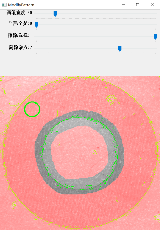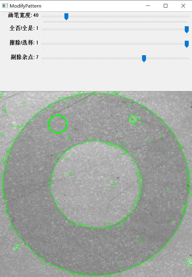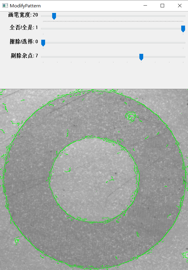 当图像的质量较差时,边缘模糊产生大量的杂点;从而增加了搜索的时间,同时影响了搜索的准确性。通过调整【剔除杂点】去除大部分的干扰点,优化了模板的轮廓信息。