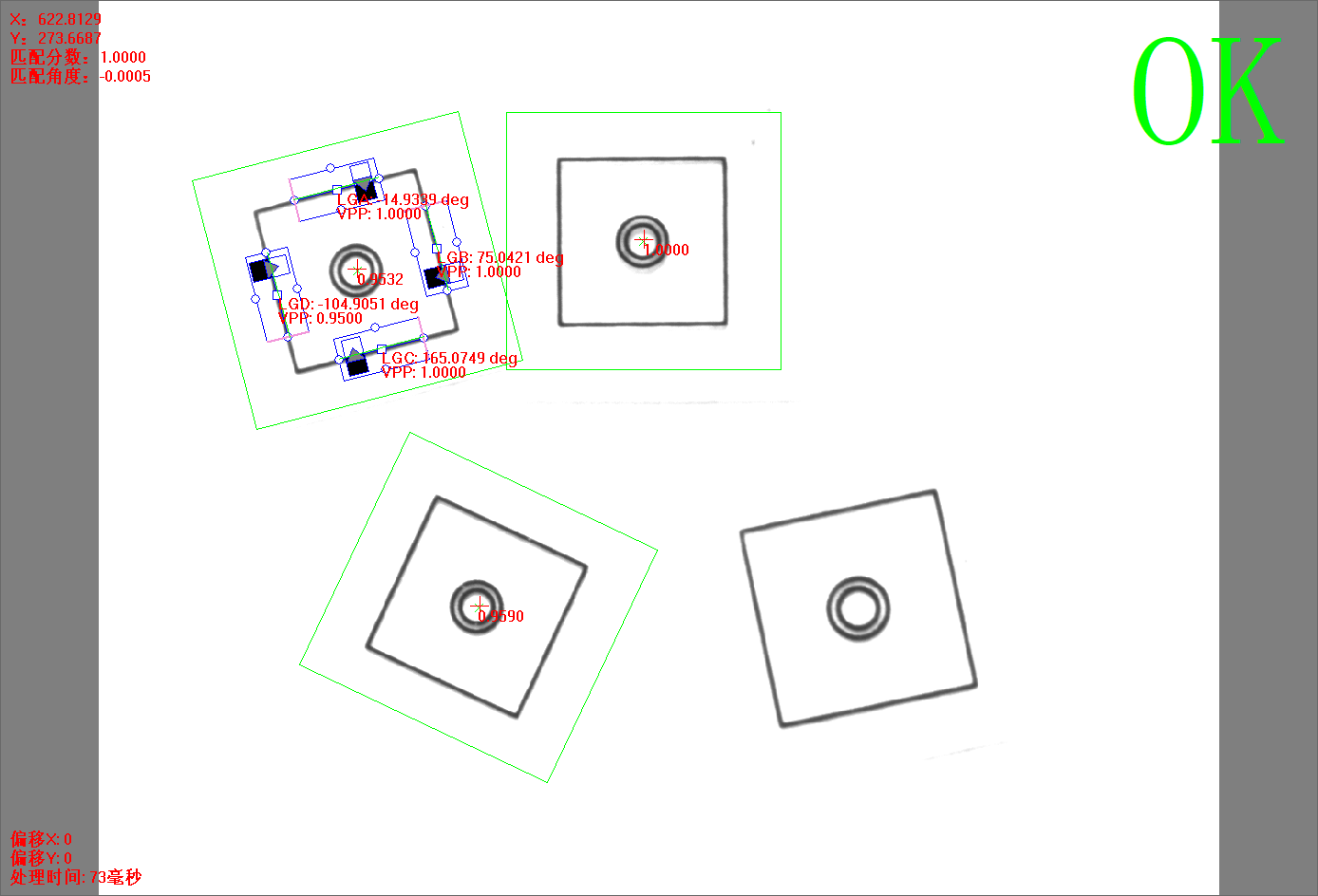 点击【方法学习】后,灰度匹配+4直线方法的所有信息将被保存,并自动进行图像处理,相关的信息将显示。