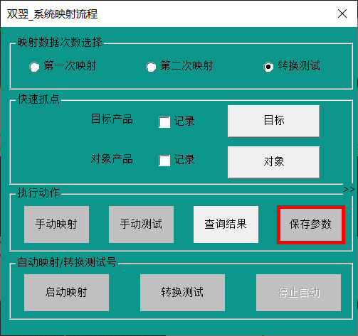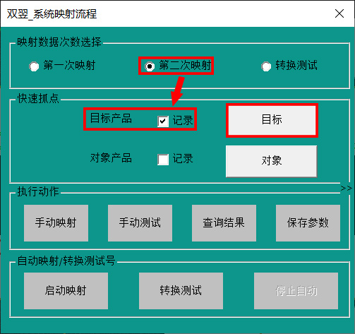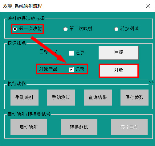 1) 系统全体停止,将TP搬运到目标相机下,打开映射界面,勾选第一次映射,再勾选目标产品“记录”,点击“目标”按钮,系统会抓取Mark点的坐标。