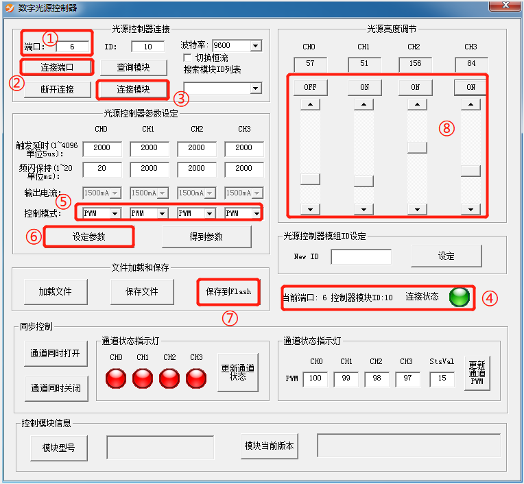 →将光源连接到光源控制器上,点击图中⑧所在区域中的按钮及滑块控制光源开关及亮灭,确认光源控制器无异常,如果异常请找技术确认问题并解决。