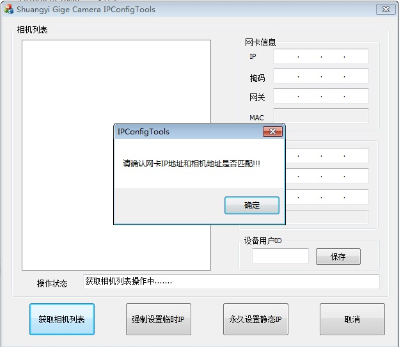 3)点击“获取相机列表”,会弹出打开相机失败以及请确认网卡IP地址和相机地址是否匹配。