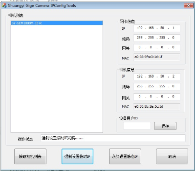 5)填写相机IP地址(默认192.168.50.2为CCD0,192.168.51.2为CCD1,以此类推),点击强制设置临时IP,系统会显示强制设置临时IP完成……