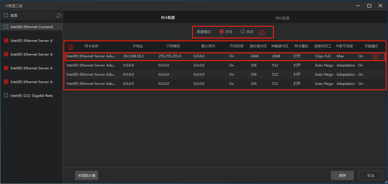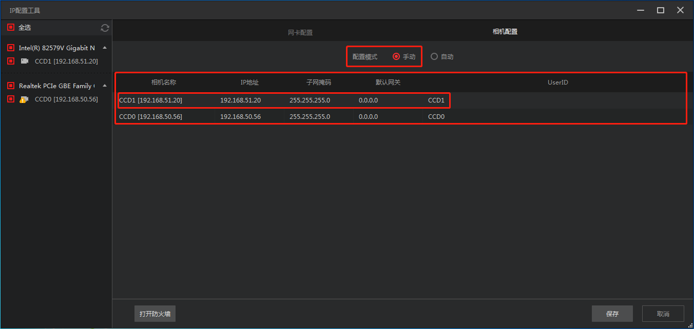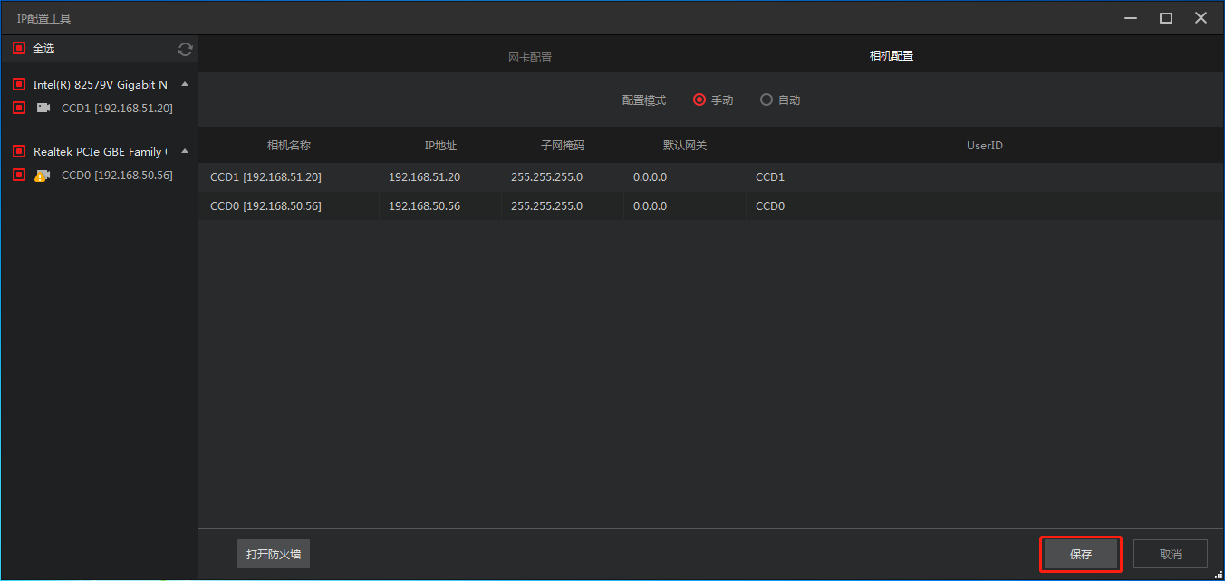 6. 选中好需要配置的相机后在手动配置模式中可手动配置好相机IP;