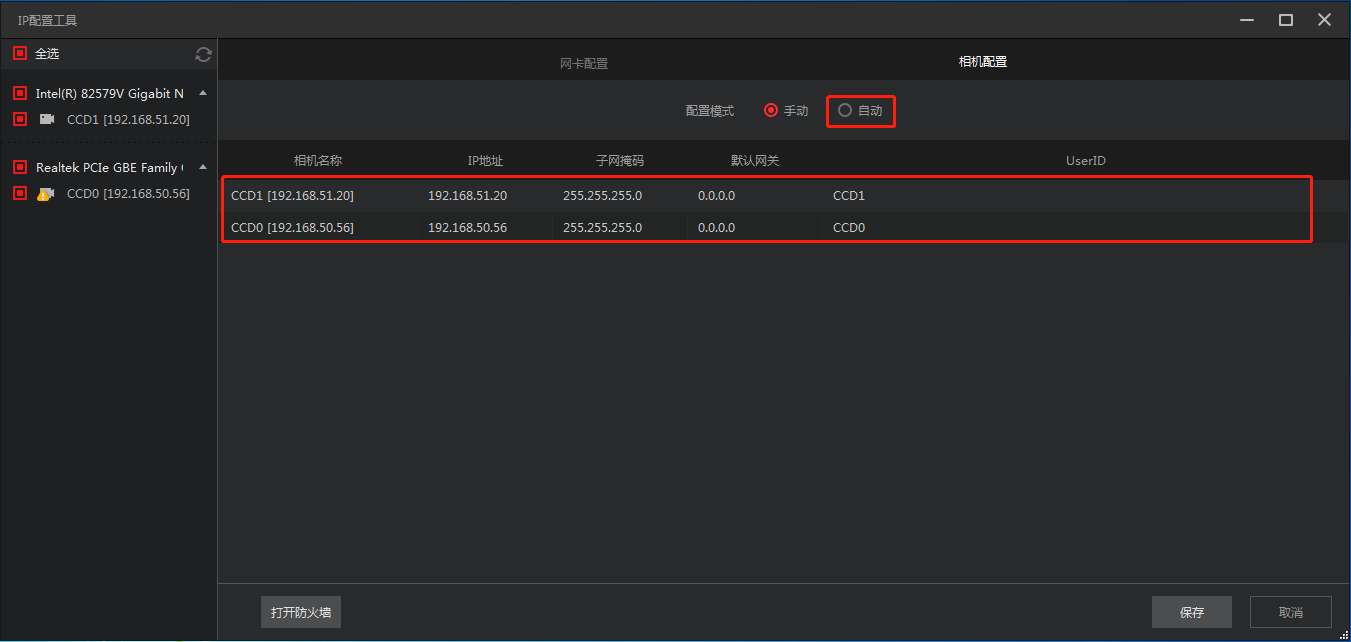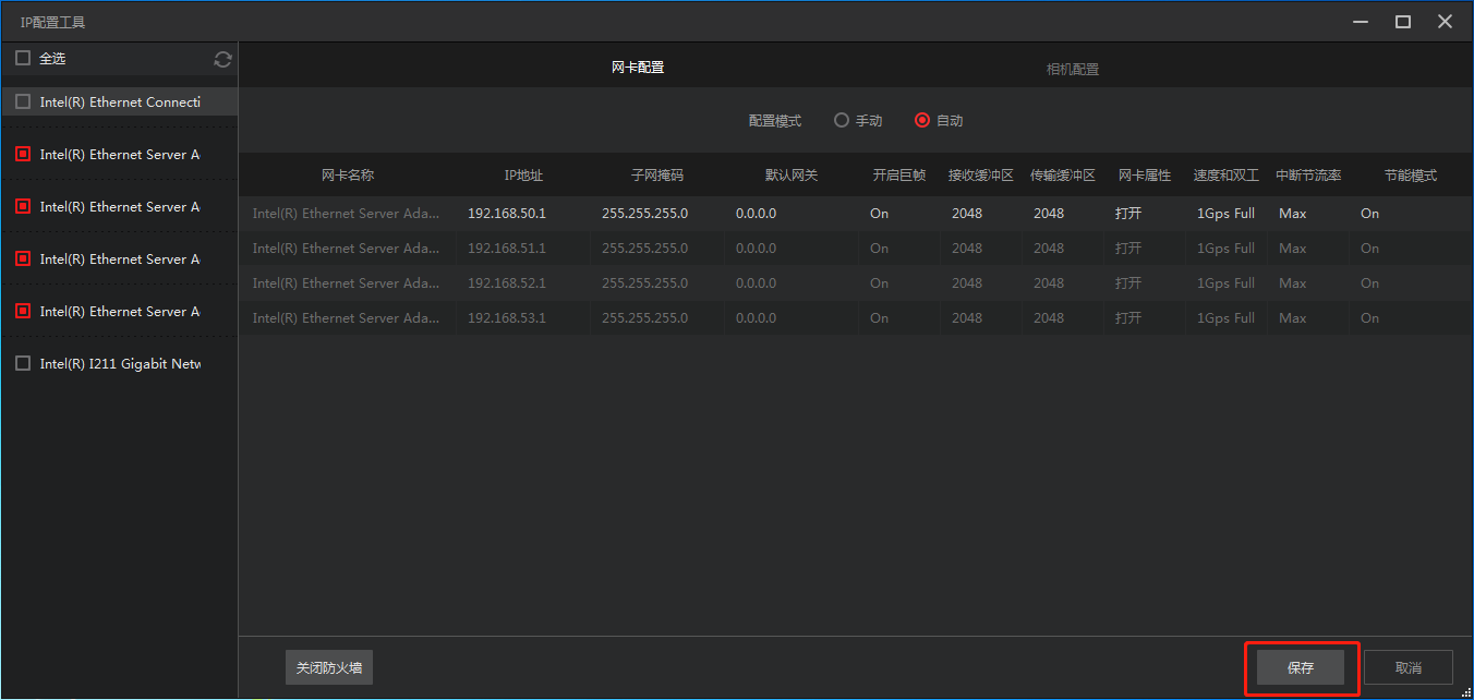 7. 也可以像配置网卡一样,配置好第一个相机后点击配置模式中的自动,让工具自动配置剩余相机的IP;