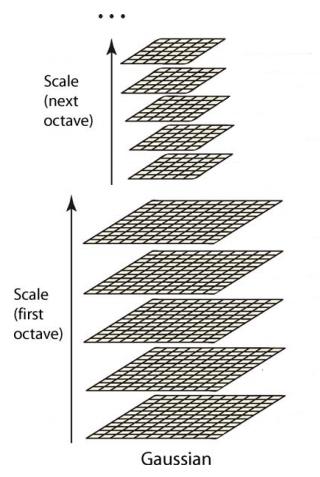 高斯金字塔构建过程中,一般首先将图像扩大一倍,在扩大的图像的基础之上构建高斯金字塔,然后对该尺寸下图像进行高斯模糊,几幅模糊之后的图像集合构成了一个八度,然后对该八度下的最模糊的一幅图像进行下采样的过程,长和宽分别缩短一倍,图像面积变为原来四分之一。这幅图像就是下一个八度的初始图像,在初始图像图像的基础上完成属于这个八度的高斯模糊处理,以此类推完成整个算法所需要的所有八度构建,这样这个高斯金字塔就构建出来了。构建出的金字塔如下图所示: