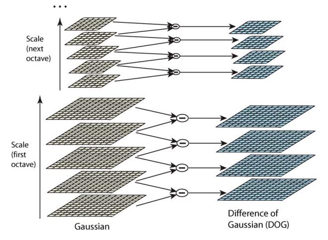 构建高斯金字塔是为了后续构建差分高斯金字塔。对同一个八度的两幅相邻的图像做差得到插值图像,所有八度的这些插值图像的集合,就构成了差分高斯金字塔。过程如下图所示,差分高斯金字塔的好处是为后续的特征点的提取提供了方便。
