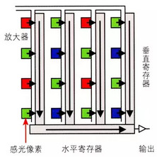 在感光像点接受光照之后,感光元件产生对应的电流,电流大小与光强对应,因此感光元件直接输出的电信号是模拟的。在CCD传感器中,每一个感光元件都不对此作进一步的处理,而是将它直接输出到垂直寄存器,传到水平寄存器中,最后才能形成统一的输出。由于感光元件生成的电信号实在太微弱了加上在此过程中会产生大量电压损耗,无法直接进行模数转换工作,因此这些输出数据必须做统一的放大处理—这项任务是由CCD传感器中的放大器专门负责,经放大器处理之后,每个像点的电信号强度都获得同样幅度的增大;因信号只通过一个放大器进行放大,所以产生的噪点较少。但由于CCD本身无法将模拟信号直接转换为数字信号,因此还需要一个专门的模数转换芯片进行处理,最终以二进制数字图像矩阵的形式输出给专门的DSP处理芯片。