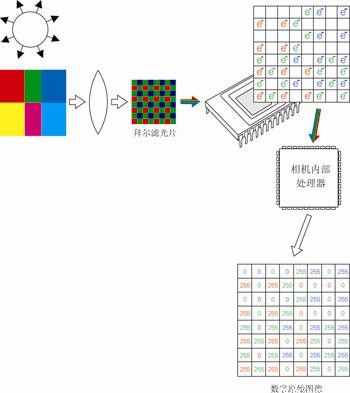 CCD 芯片按比例将一定数量的光子转换为一定数量的电子,但光子的波长,也就是光线的颜色,却没有在这一过程中被转换为任何形式的电信号,因此 CCD 实际上是无法区分颜色的。
