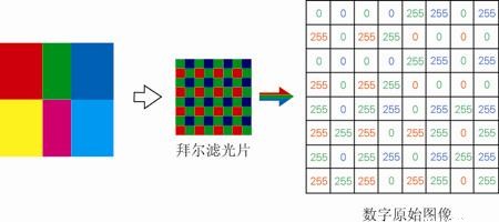 如果在 CCD 表面覆盖一个只含红绿蓝三色的马赛克滤镜,再加上对其输出信号的处理算法,就可以实现一个 CCD 输出彩色图像数字信号。由于这个设计理念最初由拜尔(Bayer)先生提出,所以这种滤镜也被称作拜尔滤镜。