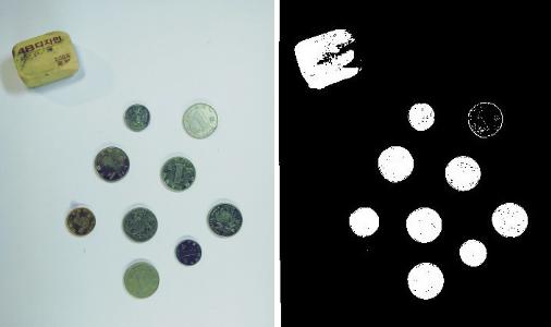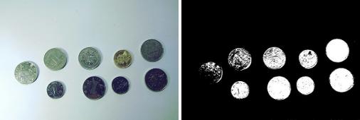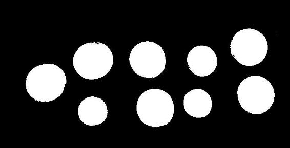 之后仅对既有物体又有背景的块进行自动阈值处理、二值化、填充孔洞,可以得到图6的结果,可以看到每个硬币都被很好的分割出来: