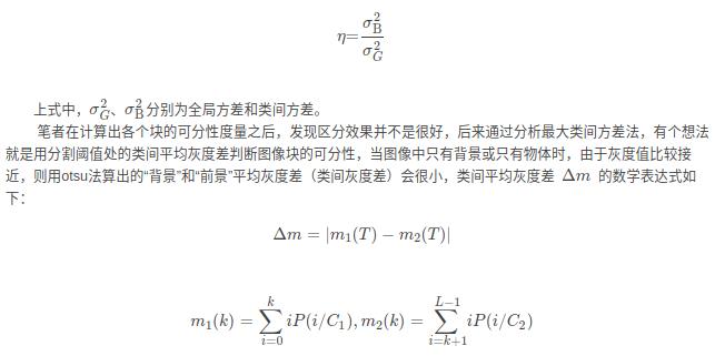 笔者在计算出各个块的可分性度量之后,发现区分效果并不是很好,后来通过分析最大类间方差法,有个想法就是用分割阈值处的类间平均灰度差判断图像块的可分性,当图像中只有背景或只有物体时,由于灰度值比较接近,则用otsu法算出的“背景”和“前景”平均灰度差(类间灰度差)会很小。