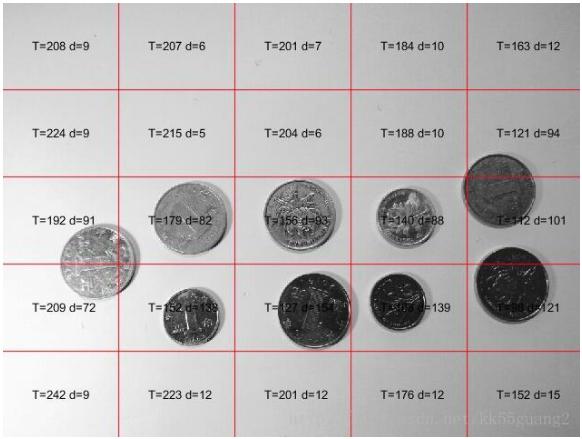 图5为分块结果,示例中分块与硬币大小相当,分完块之后就可以按块进行全局阈值法(这里采用常用的最大类间方差法,otsu法)处理了,但是需要注意的是有的块中只有背景,这个时候需要进行判断,排除对这种块的处理。