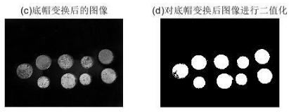 由于原图是背景亮,前景暗,对原图进行底帽变换以解决光照不均匀的问题,这里先给出处理结果,如下图,可以看到底帽变换后的图像删除了大部分非均匀背景,最后阈值处理后,左边的硬币被分割出来,有少量残缺,但是影响不大,后续可以通过形态学的其他处理将残缺补齐。