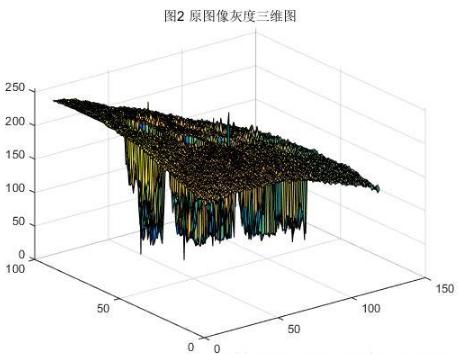 图2为原图灰度三维图,上方弯曲的走势显示了图像各部分光照不均匀造成的背景灰度不均现象,其中凹陷对应图像中灰度值比较小的区域,也就是图像中的硬币。