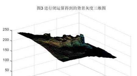 通过选取大于硬币大小的合适结构元,可以看成一个球体在灰度曲面上滚动,球体下表面的轨迹构成闭运算的曲面,如图3所示,原图中的凹陷都被填上,可以近似代表不均匀的背景。闭运算完之后再减去原图像即可得到背景近似均匀的图像,如图4所示,对应的灰度图可以看图1(c),可以看到不均匀的背景被大致去除,这将十分有助于后面的阈值分割。