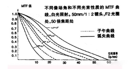 MTF表示的是调制传递函数的值随空间频率和像场位置变化的函数关系,它有很多种类型,最主要的两种就是MTF值与空间频率的关系以及MTF值和像场半径的关系,空间频率的单位是线对/毫米(lp/mm),随着空间频率的增加MTF值逐渐减小;像场半径是像场上任意一点到像场中心的距离,在像场内的分辨率标板或光栅中的黑白线条,应按两个主要的方向放置,这两个方向是检验光学成像系统的法定方向,一个是平行于像场半径的弧矢方向,也叫径向,另一个是垂直于像场半径的子午方向,也叫切向。一般弧矢方向的MTF值要高于子午方向,像场中心的MTF值最高,随之像场半径增大MTF值减小。