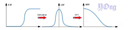 倾斜边缘法的算法流程下图,首先获取倾斜边缘的边缘扩散函数(ESF),然后求导得到对应的线扩散函数(LSF),最后傅里叶变换得到MTF。