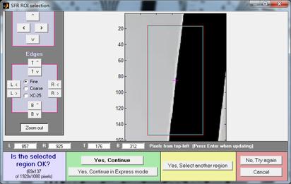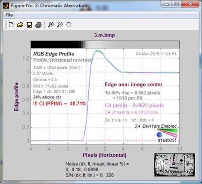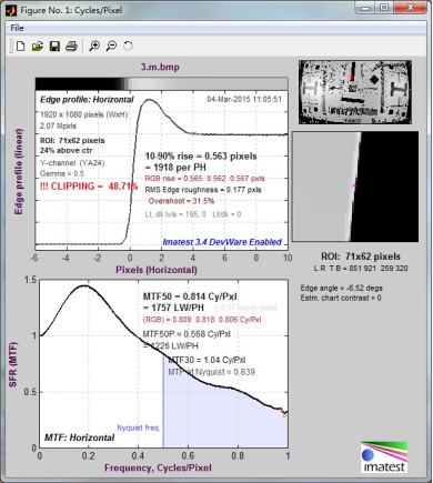 • SFR: 测试解析力,选择图像的斜边,使用刃边法解算MTF