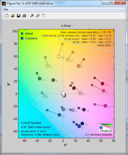 色彩还原指彩色CCD、CMOS经过拍摄加工后,彩色摄影画面的色彩大体上和原景物的色彩相一致。影响色彩还原的因素有CCD、CMOS的性能,摄影镜头的质量,光线的色温等。今天我们通过在D65光源下测试摄像头对色彩的还原能力来聊聊如何使用Imatest进行色彩还原测试。