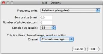ImageJ 需要下载安装 Slanted Edge Modulation Transfer Function 插件,需要注意的是只能测量竖直倾斜边缘,从左至右由黑变白的矩形框,具体选项设置参考如下,sensor size单位是mm。