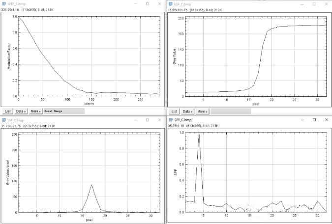 可以得到如下4张图表,除了MTF外还有ESF、LSF、SPP,比较方便的一点是我们通过Data-Add将不同的MTF曲线添加至一张图表中进行对比分析。