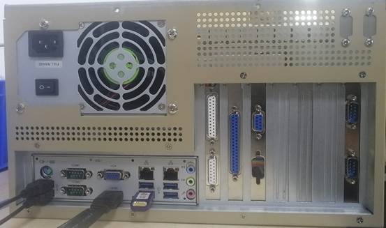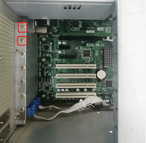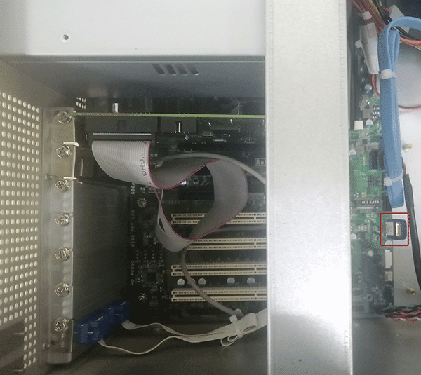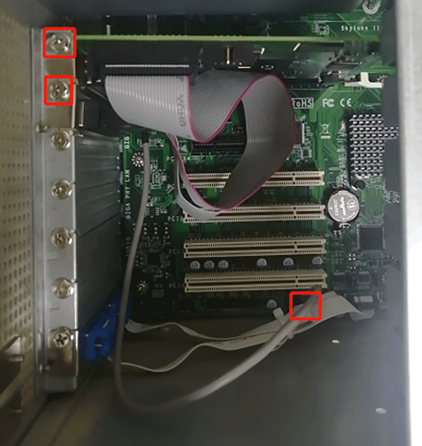 →将激光打标卡插入PCIe插槽,锁螺丝固定好,将图中激光打标卡上排线插入主板USB针脚上