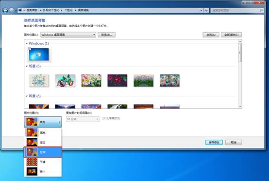 在“图片位置”选项中选择“拉伸”