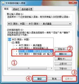 选中不需要的输入法,点击“删除”→“应用”→“确定”