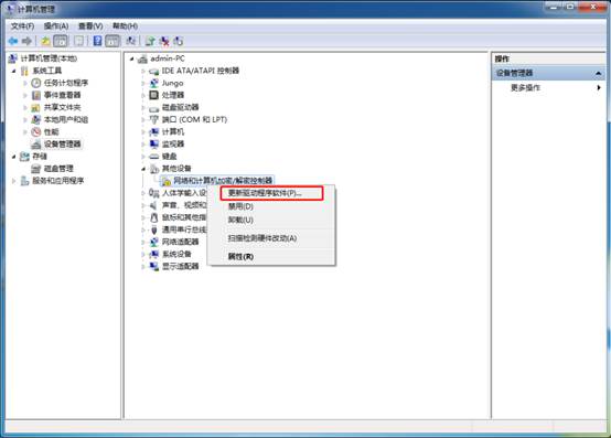 选择计算机右击—管理—计算机管理(本地)—设备管理器—其他设备—网络和计算机加密/解密控制器—更新驱动程序软件