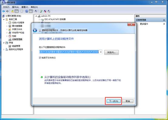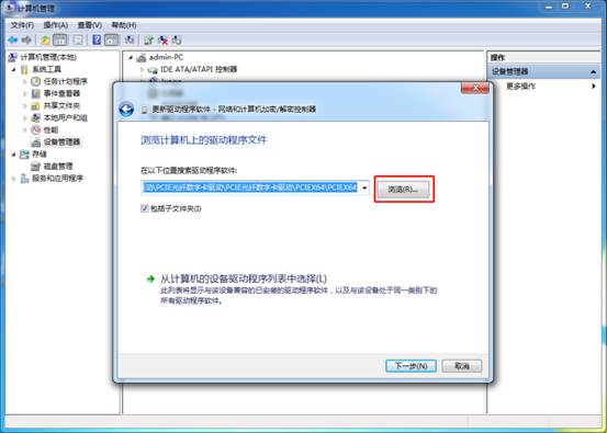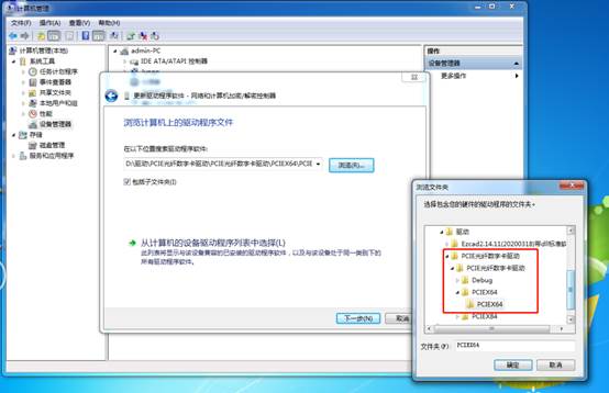 点击浏览查找驱动,选中驱动路劲“D:\驱动\PCIE光纤数字卡驱动\PCIE光纤数字卡驱动\PCIEX64\PCIEX64”后确定,