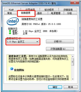 →将“链接速度”选项卡中的“速度和双工”属性,修改为“1.0 Gbps全双工”