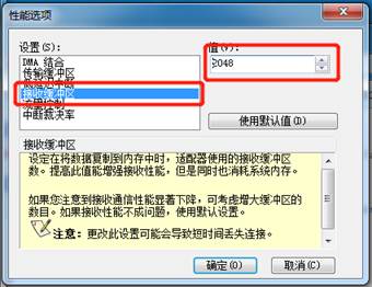 →点击“高级”选项卡中的“性能选项”,点击属性,将“传输缓冲区”的值修改为最大值,图中最大值为“2048”