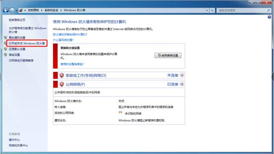 →点击“打开或关闭Windows防火墙”