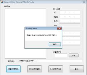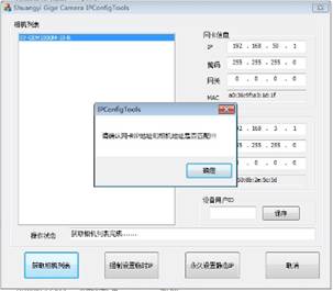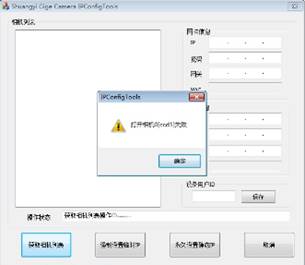 3) 点击“获取相机列表”,会弹出打开相机失败以及请确认网卡IP地址和相机地址是否匹配。