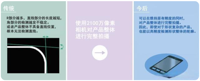 1.R部分较多的产品,角部分的检测不稳定,位置检测也不稳定。只要用2100万像素相机对产品整体进行完整拍摄,即使形状复杂,也能实现高精度的轮廓检测。对于形状多样的产品,也能实现高精度的对准。